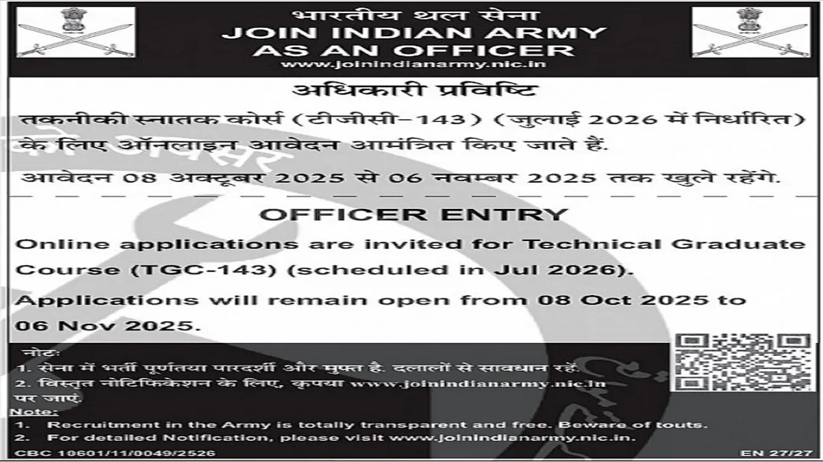 The Indian Army has released a new recruitment notification for the Technical Graduate Course (TGC) Officers Entry 143 courses set to commence from July 2026. This initiative aims to recruit eligible candidates through an online application process, providing them with opportunities to serve in various capacities within the technical domains of the armed forces.