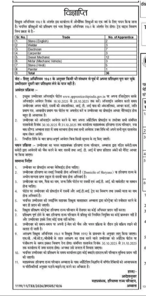Ambala Roadways has released a notification for ITI Trade Apprentice positions with 36 vacancies. Only candidates from Haryana are eligible to apply.