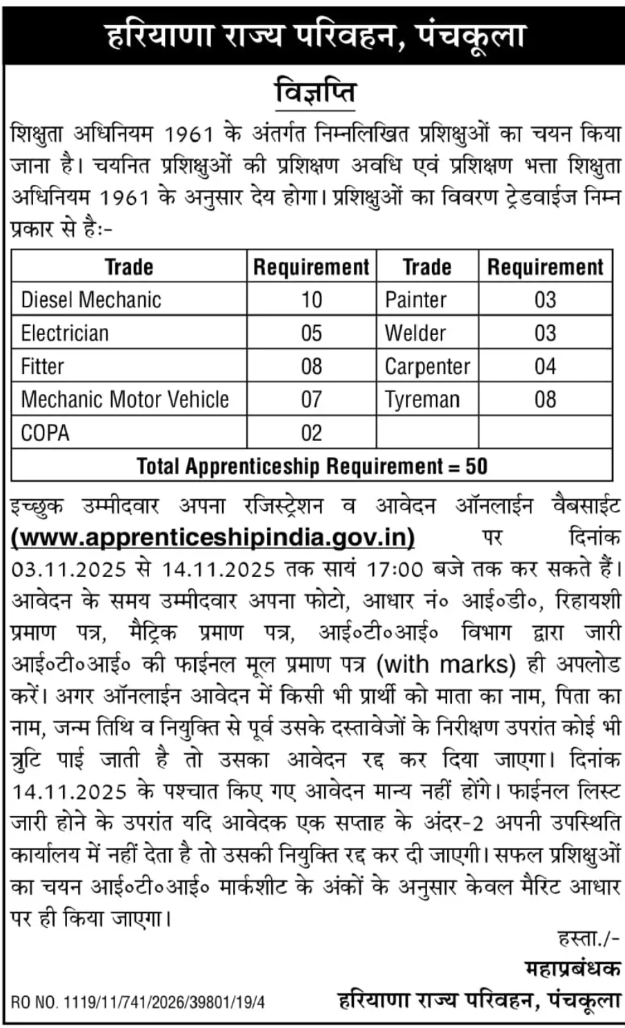 The General Manager, Haryana Roadways (Panchkula Depot) has issued a notification for 50 Apprentice vacancies.