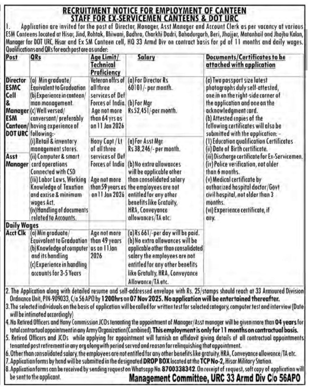 - Address: 33 Armoured Division Ordnance Unit, PIN-909033, C/o 56 APO by 12:00 hrs on November 7, 2025.