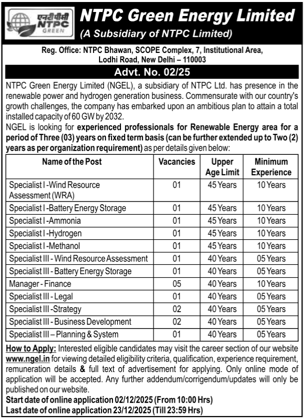 NTPC Green Energy Limited (NGEL) invites applications for 18 Specialist positions in various renewable energy domains on a fixed-term basis of three years, extendable up to five years. The last date to apply is December 23, 2025.