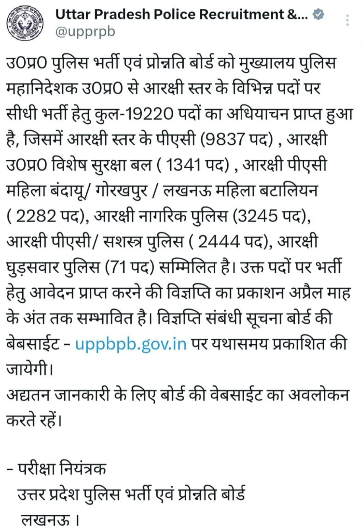 The Uttar Pradesh Police Recruitment and Promotion Board (UPPRPB) has released a notification for 19220 constable-level positions. Eligible candidates can apply online starting from December 2025, with the last date to apply being January 2026.